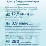 Еліміздің бірнеше өңірінде оқыту және жұмысқа орналастыру бағдарламалары жүзеге асты. Атап айтсақ, Астанада – «Jol Tap» (3,9 мың адам оқудан өтті), Алматы, Ақтөбе және Қарағанды облыстарында – «Jumys Tap» (10 мың адам жұмыспен қамтылды) бағдарламалары. Сондай-ақ Алматыда «Jobfair365» платформасы жұмыс істейді, оның көмегімен 2,5 мың жас маман жұмысқа орналасты.